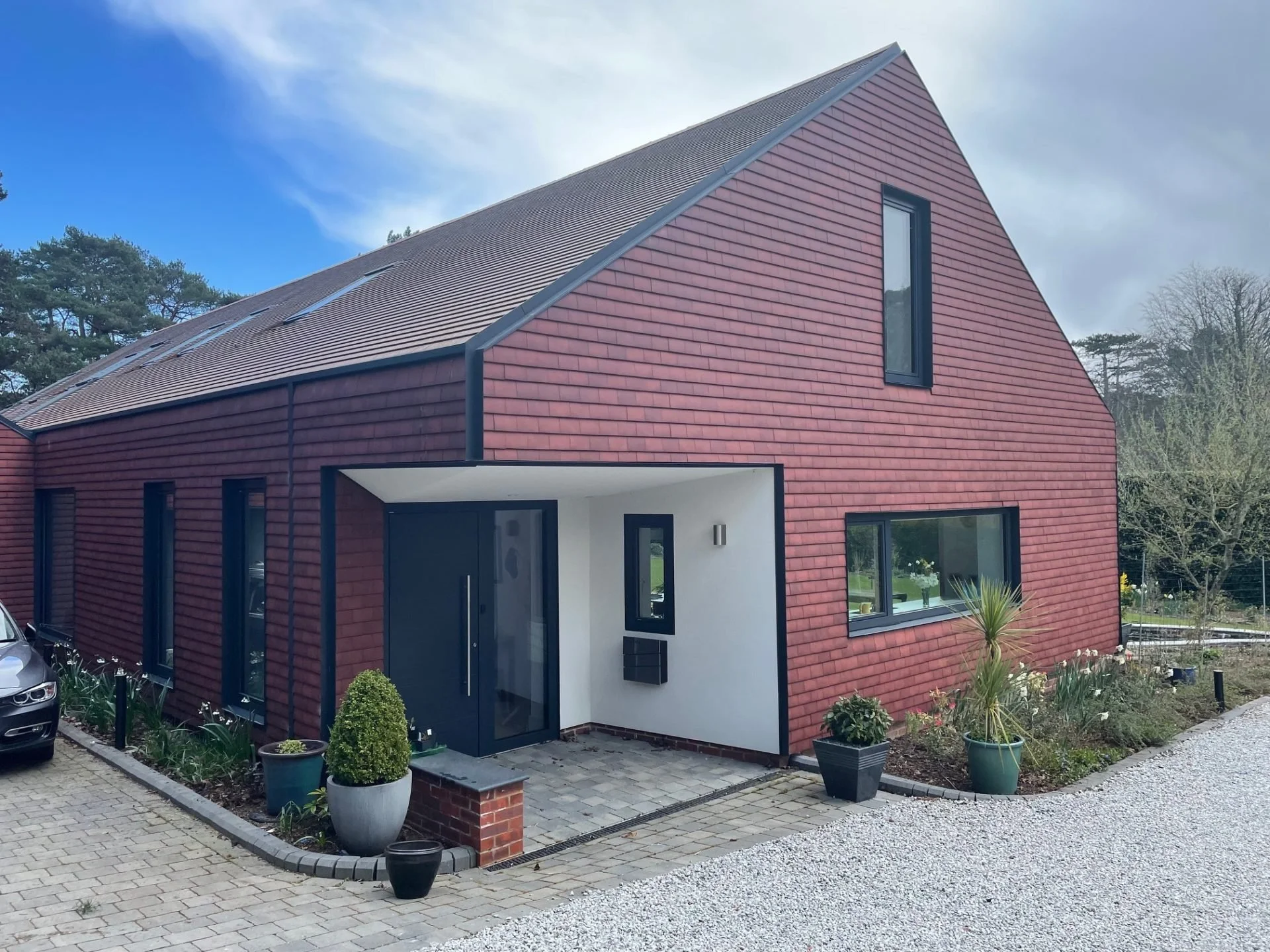 This Super Insulated Air Tight Home and artist’s studio in Surrey was designed to meet the strongest environmental and sustainability standard whilst maintaining a high level of aesthetic finish. With exceptionally high eco credentials, this project also fits beautifully in to the landscape and was fully supported by its neighbours. Whilst not a certified Passivhaus, these standards are what drove the project. Using a Passivhaus Timber Frame and Foundation System from MBC Timber Frame, this ensured an Air Tight, Cold Bridge free thermal envelope.